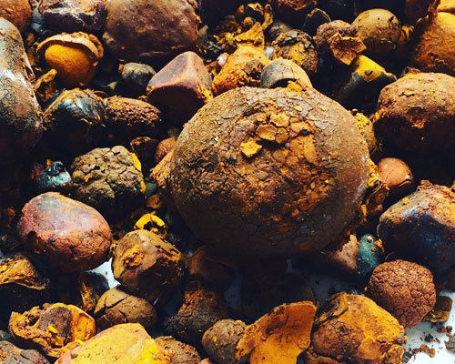 After extracting the gallstones from the cattle’s intestines there are washed thoroughly with cold water to remove blood clots, impurities etc. After washing they are dried for two to three weeks in a dark and well ventilated environment at a temperature of approx. 20 degrees Celsius. The stones have to be moved regularly for better drying and to avoid them sticking at each other. After full drying the stones are packed in hermetically sealed bags.
